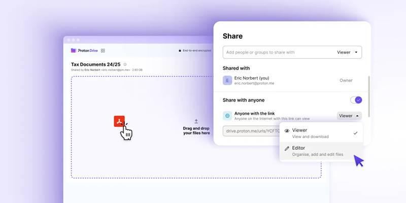 Proton ensures that users maintain full control over these shared links. Each link can be configured with one of two access roles—Viewer or Editor—determining whether the recipient can view the content or make changes, including uploading new files into shared folders.
